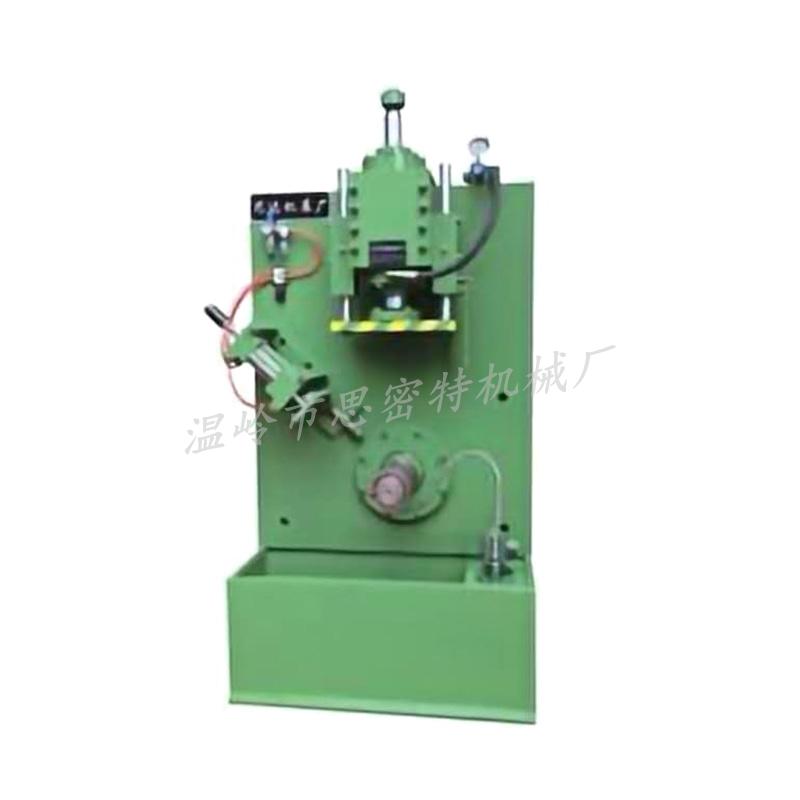 立式轮辐旋压机,包括横向油缸、下主轴、封闭力系、皮带轮、纵向油缸、卸料月牙板、纵向滑板、操作系统、仿形板、仿形阀、旋轮轴承室、初旋轮、压紧油缸、上主轴箱、卸料导向杆、精旋轮、轮辐模芯、自动进料装置、横向滑板、电机、电动出料滚道,其特征在于:所述封闭力系,包括机座、立柱、活动梁、顶梁,其一侧设有自动进料装置,另一侧设有电动出料滚道;所述精旋轮和初旋轮由纵向油缸、纵向滑板、横向油缸、旋轮轴承室和横向滑板带动完成设计曲线运动;所述仿形阀通过仿形板的形状控制横向油缸和纵向油缸的运动轨迹,并与相应形状的轮辐模芯结合。该立式轮辐旋压机,提高轮辐性能,延长寿命,保障行车安全。
